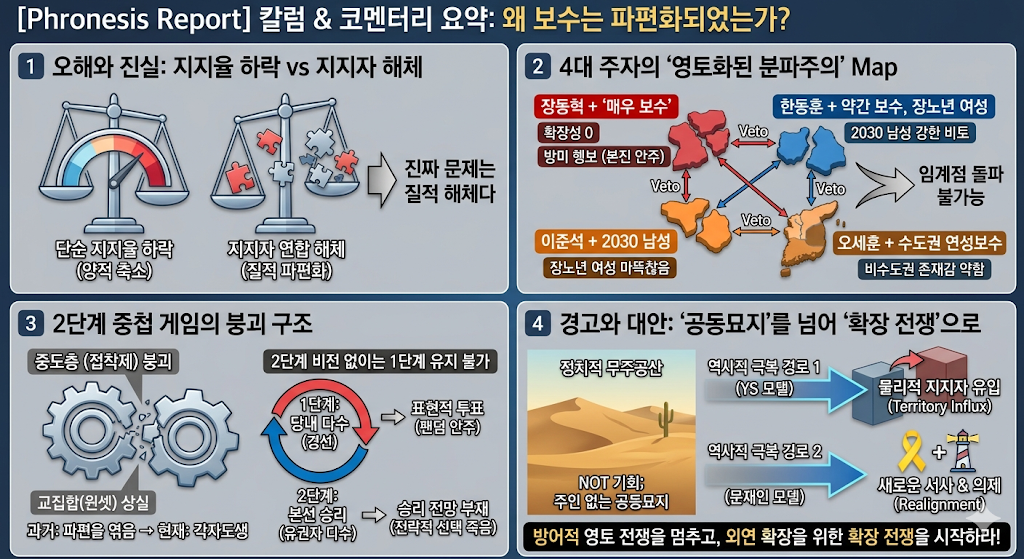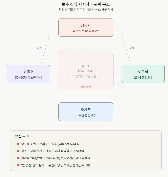 국민의힘, 나아가 보수 진영의 진짜 문제는 지지율의 절대 수준이 낮은 것에만 있지 않다. 지지자 연합이 해체되어 파편화되었다는 데 핵심 원인이 있다. 장동혁 국민의힘 대표, 한동훈 전 국민의힘 대표, 이준석 개혁신당 대표, 오세훈 서울시장 등 범보수 진영의 대표 주자들에 대한 유권자의 지지 동향이 이를 보여준다. 이들 모두 파편화 그룹 중 일부의 지지만 확보하고 있을 뿐 그 확장성이 낮다. 그 결과, 그 누구도 보수 진영을 재편할 수 있는 임계점을 넘는 정치력을 확보하지 못하고 있다.