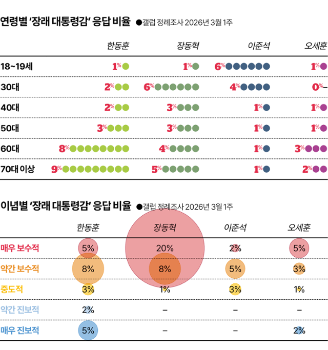 갤럽이 지난달 초 발표한 차기 지도자 선호 결과는 보수 진영의 이 같은 파편화 상황을 잘 보여준다. 장 대표는 '매우 보수적'인 집단에서는 압도적 지지를 받았지만, 거기까지가 전부다. 더 이상의 확장성이 없었다. 한 전 대표는 약간 보수적인 장노년, 특히 여성의 지지가 중심이었다. 오 시장은 수도권 연성 보수가 지지기반이었다. 이 대표는 20~30대 중산층 남성 위주였다.